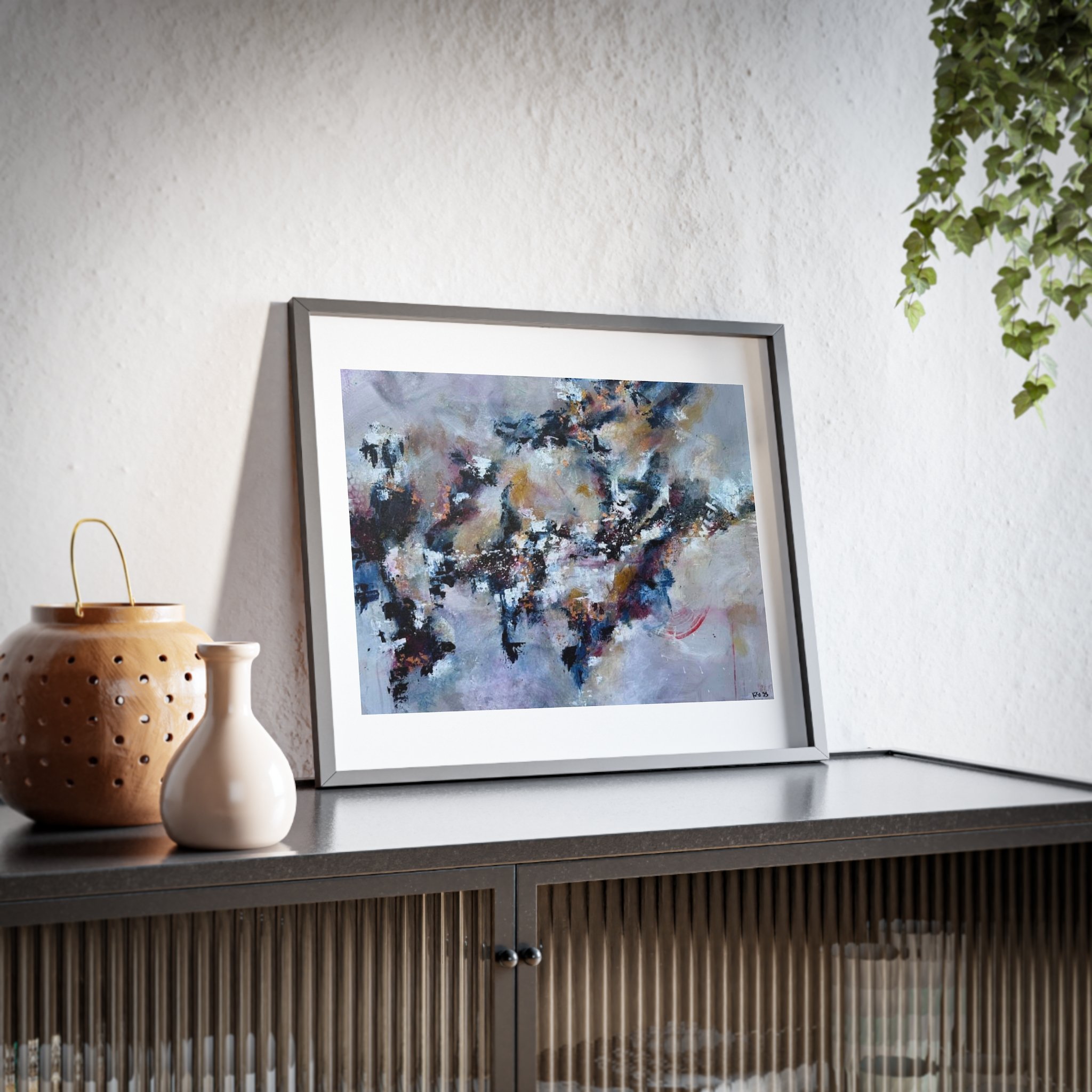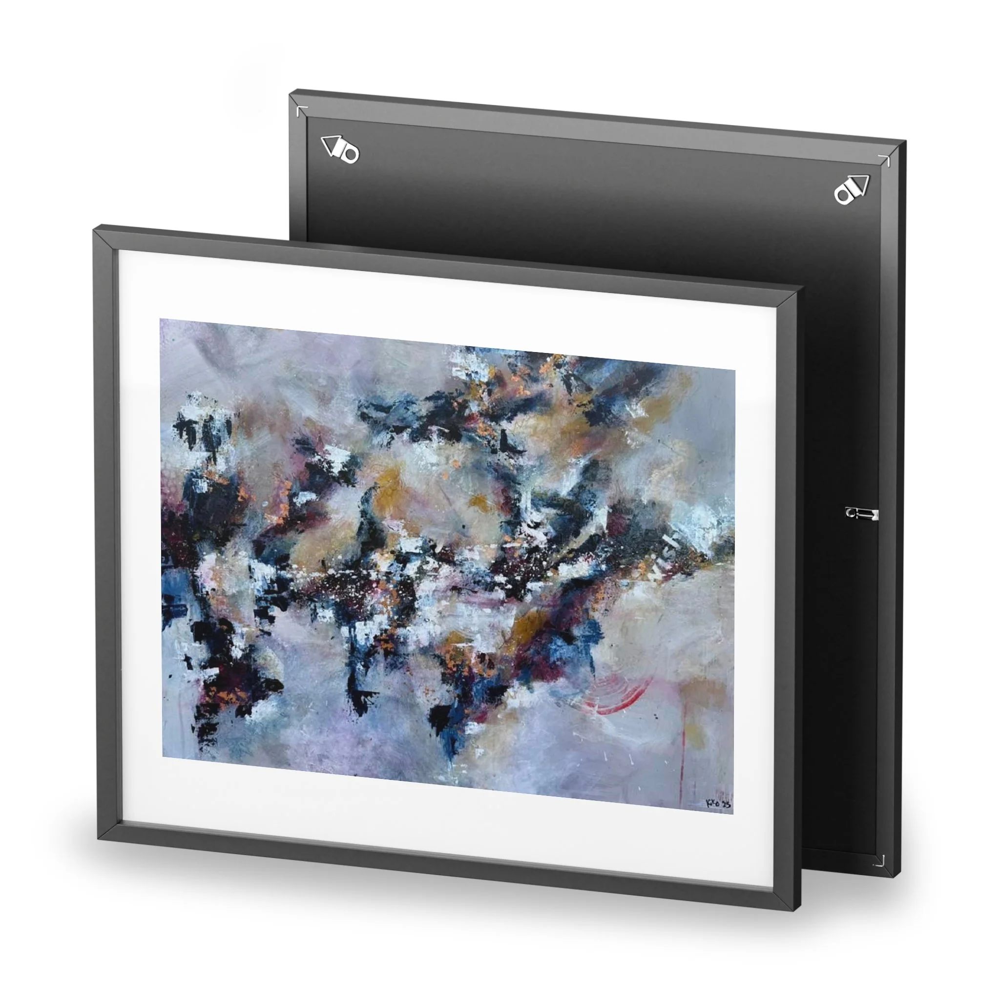 A framed matte poster that brings a painterly splash of color into any room. The high-definition print sits on thick, smooth matte paper and is set within a slim black Perspex frame with a crisp white inner matboard, giving the artwork room to breathe and a refined gallery feel. The rich, vivid inks capture deep blues, pinks, and warm highlights in the design, while the non-reflective matte finish keeps the texture subtle and elegant. Lightweight yet sturdy, the frame hangs easily in horizontal or vertical orientation and comes in three sizes to suit shelves, narrow walls, or statement displays. Place it over a console, in a reading nook, or cluster several for a curated wall vignette — it looks like an original piece, but arrives ready to hang.